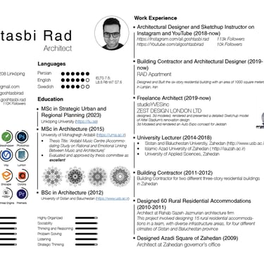 I am Ali Rad. My educational journey includes an MSc in Strategic Urban and Regional Planning from the University of Linköping, Sweden, as well as an MSc in Architecture and a BSc in Architecture, where I honed my skills in strategic planning, cooperation, and project management. With a rich background, I've led construction projects and worked as a freelance architect, earning recognition for the 'Stadium of the Future, Jacksonville Jaguars.' As a SketchUp instructor, I've developed courses in three languages, reaching a broad audience. Beyond my professional life, I'm fluent in Persian, English, and Swedish, and possess a diverse skill set, including teaching and creative design.