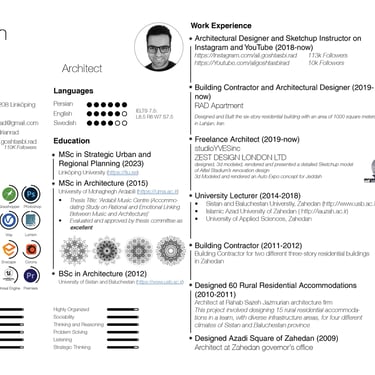 I am Adrian Rad, currently pursuing an MSc in Strategic Urban and Regional Planning at the University of Linköping, Sweden. My educational journey includes an MSc in Architecture and a BSc in Architecture, where I honed skills in strategic planning, cooperation, and project management. With a rich background, I've led construction projects and worked as a freelance architect, earning recognition for the 'Stadium of the Future, Jacksonville Jaguars.' As a Sketchup instructor, I've developed courses in three languages, reaching a broad audience. Beyond my professional life, I'm fluent in Persian, English, and Swedish, and possess a diverse skill set, including teaching, creative design.
